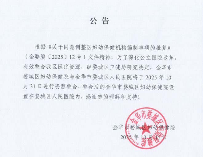 10月15日,金华婺城区官网婺城区卫生健康局发布《 区妇保院与区人民医院资源整合公告》。 公告指出: 根据《关于同意调整区妇幼保健机构编制事项的批复》 (